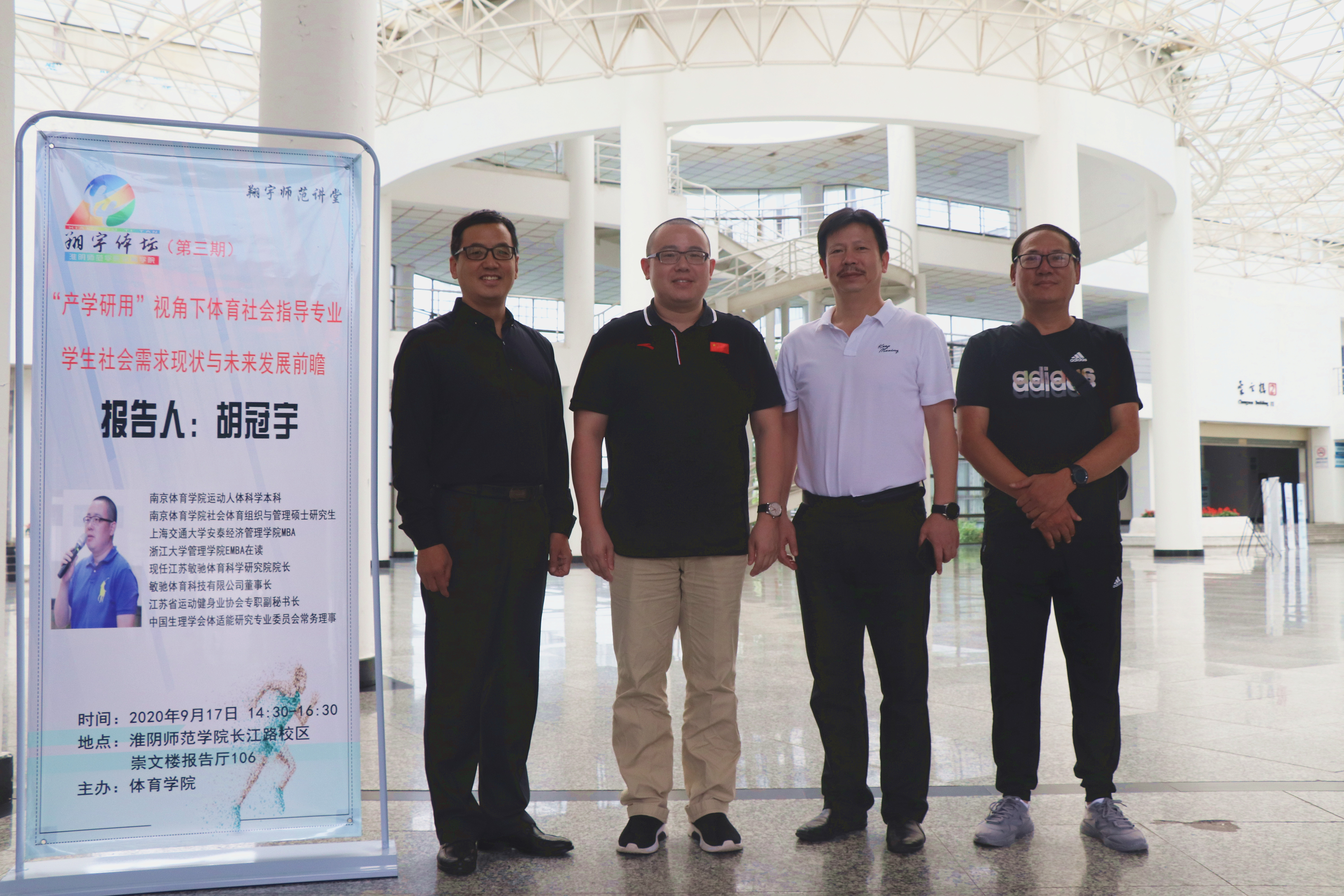 应淮阴师范学院体育学院的邀请,江苏天行在线注册体育科学研究院院长胡冠宇于9月17日下午,在体育学院报告厅为体育学院全体师生做《“产学研用”视角下社会体育指导专业学生社会需求现状与未来发展前瞻》的学术讲座。